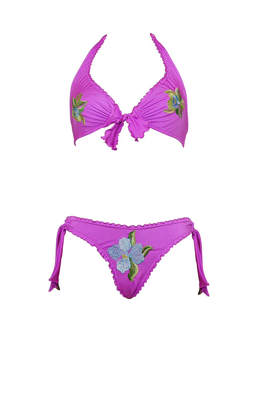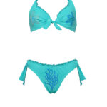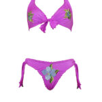 Bow bikini in embroidered Lycra, high-waisted bottoms with adjustable fabric rings, finished with filet crochet embroidery with stones.