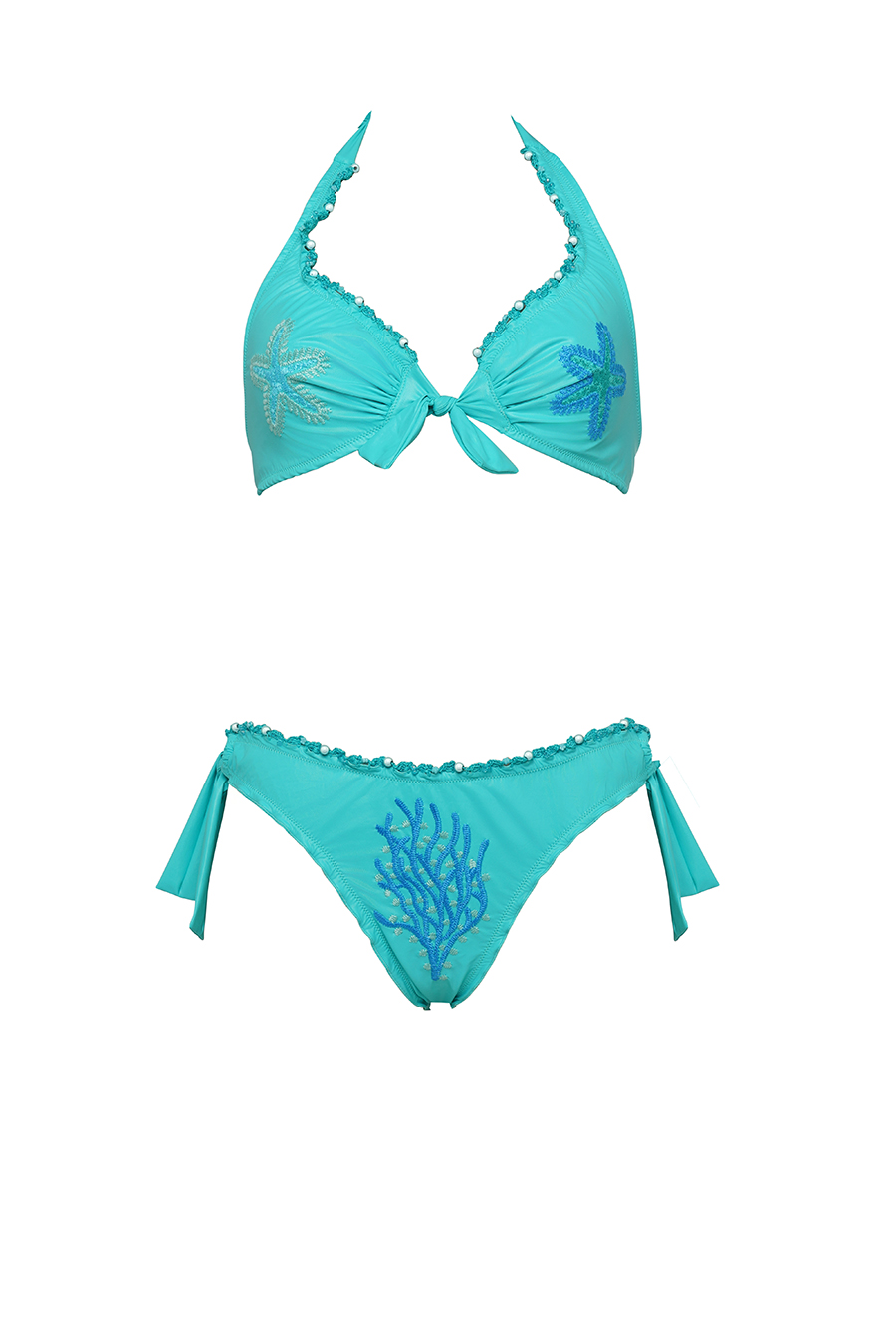 BIKINI FIOCCO IN LYCRA RICAMATO, SLIP ALTO CON ANELLI IN TESSUTO REGOLABILI, RIFINITO CON RICAMO UNCINETTO FILE’ CON PIETRE