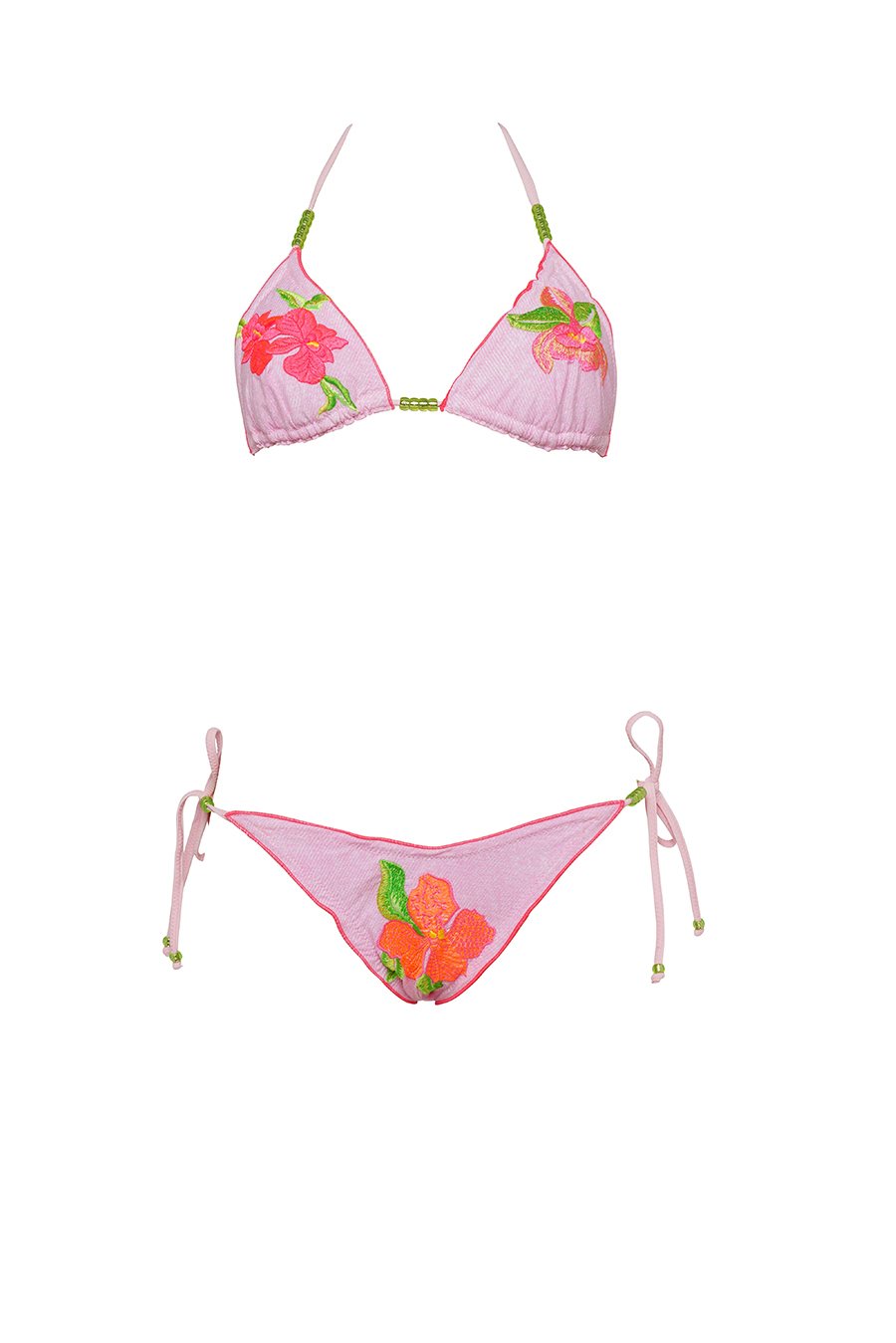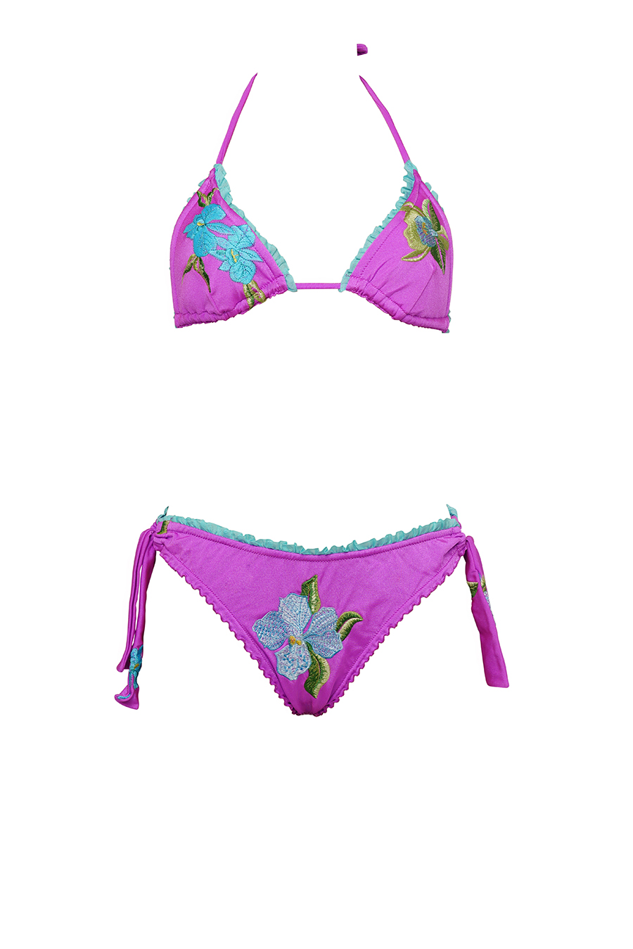 BIKINI TRIANGOLO IN LYCRA RICAMATO, SLIP CON LACCETTI , RIFINITO CON ROUCHES